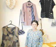 着物生地を使った洋服と森さん(喫茶ギャラリーくじら山で)