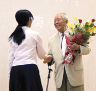 講演後、生徒から花束を受け取る小柴昌俊氏(豊橋南高校で)