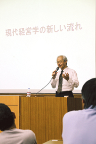 この日は、30~70歳代までの70人が聴講。同大学経営学部の佐藤勝尚教授(67)が「現在経営学の新潮流」と題し、経営学の基礎や経営学の新しい流れとして注目されるCSR(企業の社会的責任)について説明した。