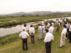 川の危険箇所を点検する一行(豊川市内の豊川河川敷で)