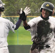豊橋中央-豊橋東8回表、4点目の生還を喜ぶ杉田㊨(豊橋市民球場で)