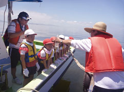 蒲郡市府相町の竹島小学校の児童が17日、同市沖の三河湾で水質や透明度などの調査に挑戦した。市事業「三河湾環境チャレンジ」の一環で、地元企業がボランティアで港湾作業船を手配した。 挑戦したのは、海の環境調査に参加した同小4年生50人のうち、...