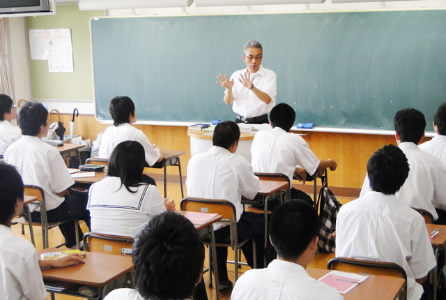 ホームルームで教師の話を聞く生徒たち(豊橋中央高校で)