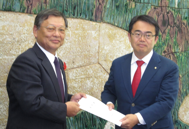 大村知事に陳情書を手渡す眞木会長㊧(田原市議会事務局提供)