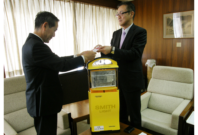 豊橋市神野新田の石油製品などの販売業「オーテック」の彦坂彰一社長ら役員4人は12日、蒲郡市役所に稲葉正吉市長を訪れ、可動式のLED充電型投光器2台を寄贈した。創立55周年を迎えた同社の記念事業の一環。 投光器は豪州スミスライト社製で、用途...