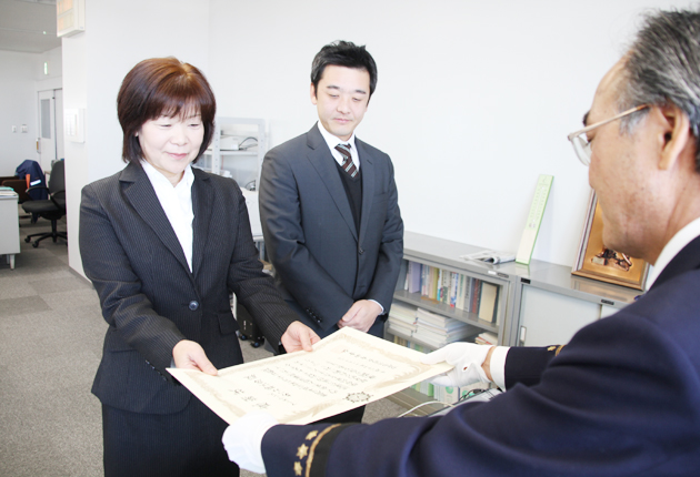 感謝状を受け取る野呂洋子さんと高井邦則店長(右隣)