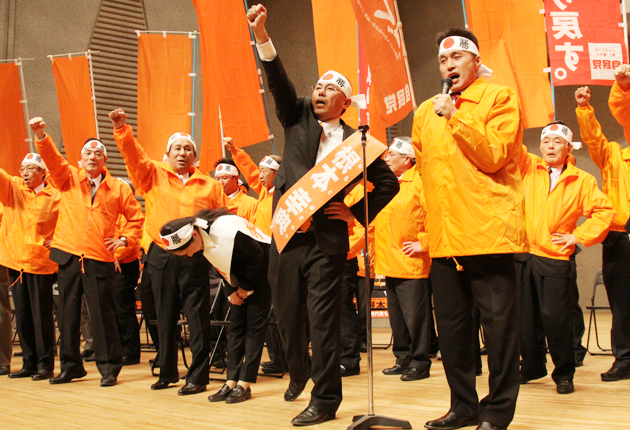 衆院選愛知15区に立候補している自民党新人の根本幸典氏(47)は12日夜、田原文化会館とライフポートとよはしの2カ所で決起集会を開き、支持者とともに、民主党からの議席奪還を誓い合った。 600人が参加した田原での決起集会を終えた根本氏は豊...