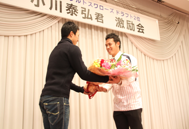 プロ野球・東京ヤクルトにドラフト2位で入団した田原市赤羽根町出身の創価大4年、小川泰弘投手(22)は15日、田原市田原町の崋山会館で開かれた母校・成章高校野球部OB会主催の入団激励会に出席し、「チームの優勝に貢献したい」と決意表明した。 ...
