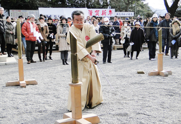 豊川市一宮町の砥鹿神社(香取武宮司)で3日、戸山流居合道東海道場・三河支部(川原義之代表)の会員11人が、居合道の奉納演武を披露した。 演武は神殿前広場で行われ、初詣客などが人垣をつくって見守った。真剣の日本刀を手にしたはかま姿の会員らは...