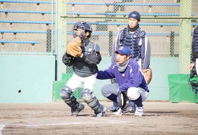 東海理化硬式野球部の選手㊥から指導を受ける捕手ら