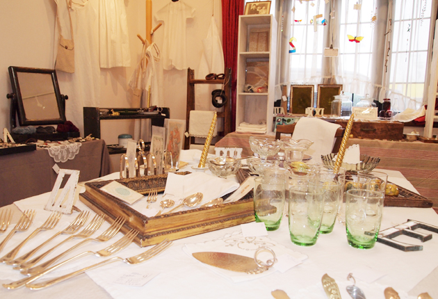 雰囲気のあるアンティーク雑貨が並ぶギャラリー内