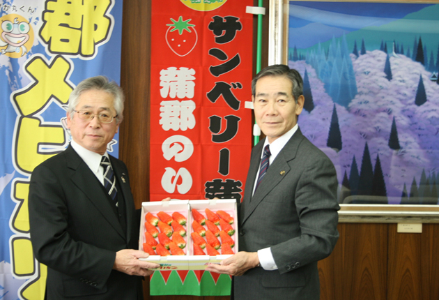 稲葉市長㊨に蒲郡産イチゴを手渡す石川組合長