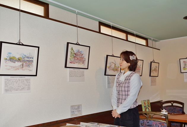 上野啓太さん作品「東三河ひとまち百景」原画と解説文の展示された、「ちろる庵」ギャラリー