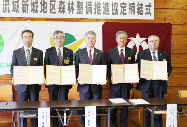 東三河流域新城地区森林整備推進協定締結式は7日、新城市庭野の愛知森林管理事務所で行われ、岩井広樹同事務所長や穂積亮次新城市長らが出席した。 森林の多面的機能の持続的発揮を目的に結ばれた今回の協定には、奥三河地域の林業活性化に向けて、国・県...