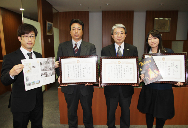 3部門入選の表彰状を手にする広報秘書課の彦坂真課長(右から2人目)ら4人