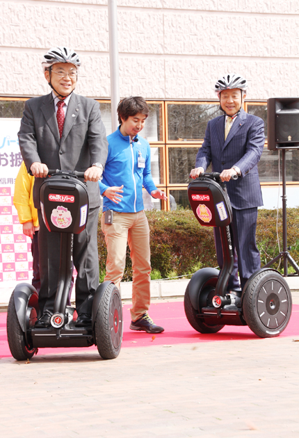 式典でセグウェイに試乗する佐原豊橋市長㊧と吉川理事長