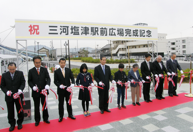 蒲郡市が、JR三河塩津・名鉄蒲郡競艇場前の両駅前広場で進めていた整備工事が終了し27日、完成記念式典が行われた。ナイター営業に伴い計画された上空通路の建設断念など、両駅周辺の住民とのあつれきを経て進められた事業がようやく完了した。 式典に...