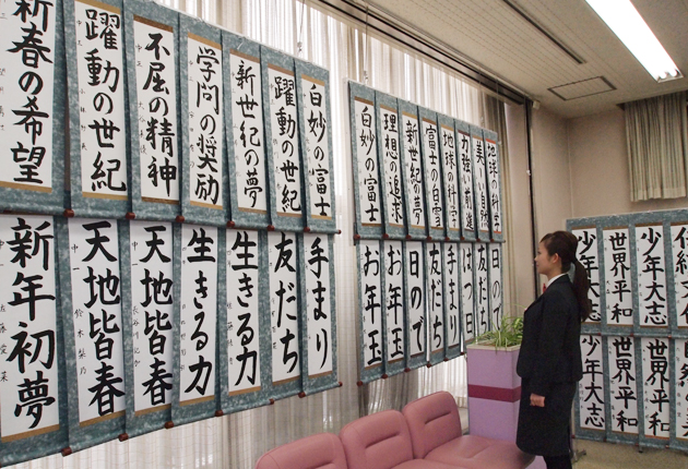 書道教室生徒の書き初め展が開かれているロビー内