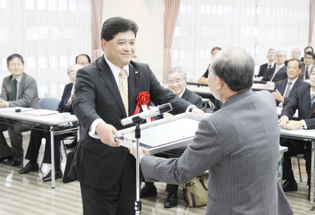 吉川会頭から賞状を受けるトピー工業豊橋製造所の武澤所長㊧
