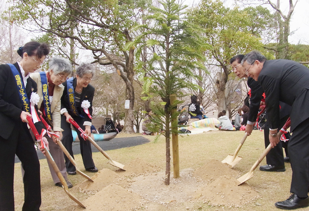 植樹の様子。右手前が佐原市長、左手前が大賀代表
