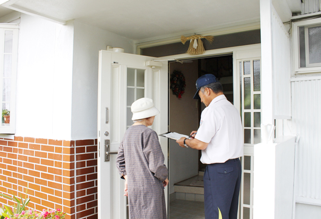 ひとり暮らし高齢者宅でアンケート調査を行う職員
