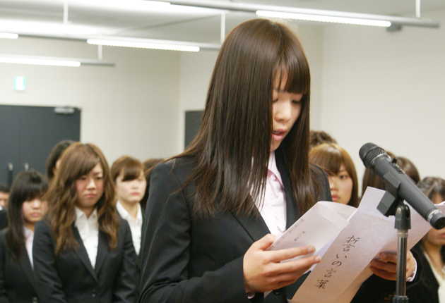 誓いを述べる田中優華梨さん(成田記念病院・大会議室で)