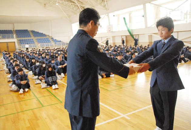豊橋署は10日、桜丘高校(豊橋市南牛川二丁目、渡邊学校長)で、自転車盗難被害を抑止するため、チェーン錠を新入学生に贈る贈呈式を行った。 同校は自転車通学者が9割を占め、防犯意識を高める目的で実施した。同署生活安全課の岩田芳尚課長代理が、新...