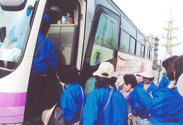 そろいのジャンパーを着て元気にバスに乗り込む団員