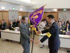 新しいシニアクラブ旗を授与される浅井会長(右)