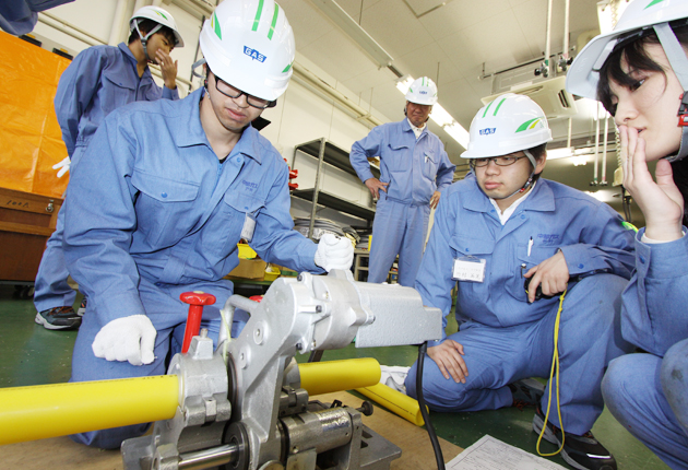 8人は1日の入社式後、グループ研修や本社研修を経て、11日から10日間、同センターで職能研修を受講中。都市ガスの生産・送出から消費まで、ガス事業に関わる基本的技能や知識を体系的に学んでいる。