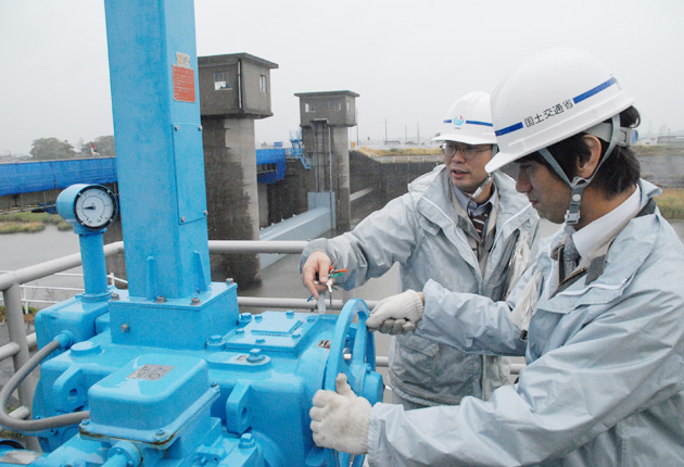 ゲートの操作法を学ぶ職員(豊川放水路管理所で)