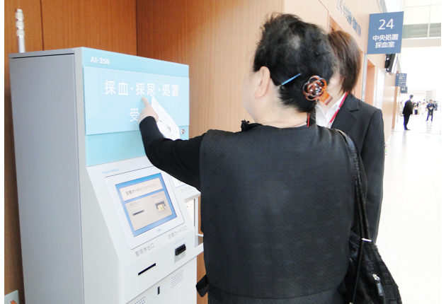 採血などの受付機の説明を受ける来院者(豊川市民病院で)