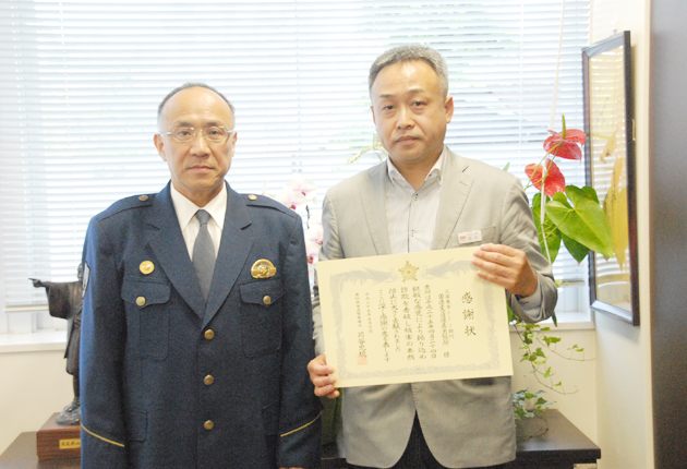 苅谷署長㊧から感謝状を受け取る田中所長㊨