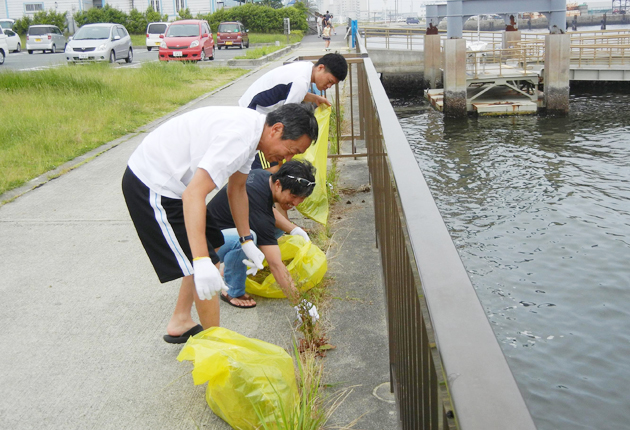 蒲郡信用金庫(竹田知史理事長)は9日、蒲郡市内一帯で16日に開催される第25回蒲郡オレンジトライアスロンのコースの清掃活動を行った。同金庫地域貢献活動の一環。 同金庫トライアスロン部の部員や有志ら計10人は、大会会場となる同市民会館南側海...