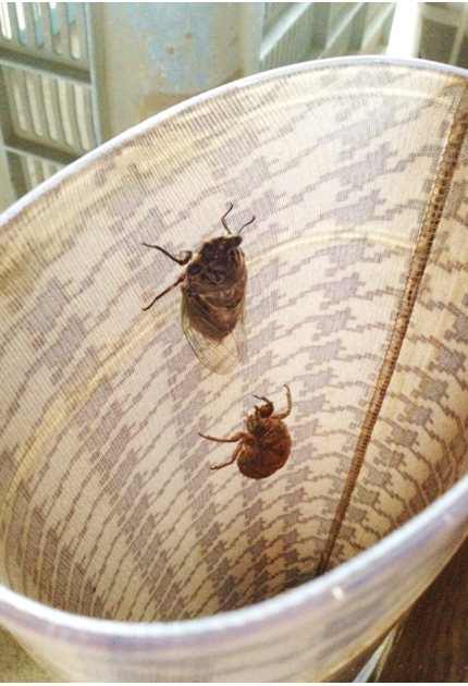 長靴で羽化して羽を乾かすクマゼミ㊤と抜け殻㊦(白井保次さん宅で)