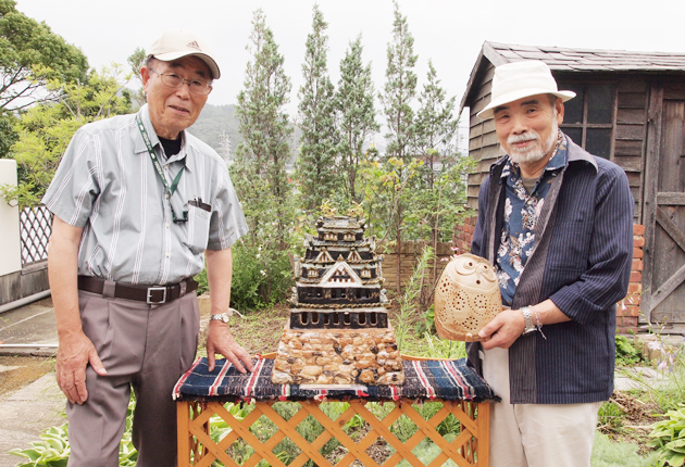 陶芸作品「松本城」を囲んで、山口さん㊧と、小柳津さん