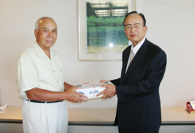 優勝した中村章一さん㊧に賞品を渡す長縄社長