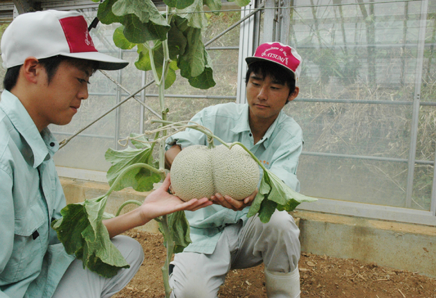 ツインメロンを収穫する生徒(渥美農業高校で)