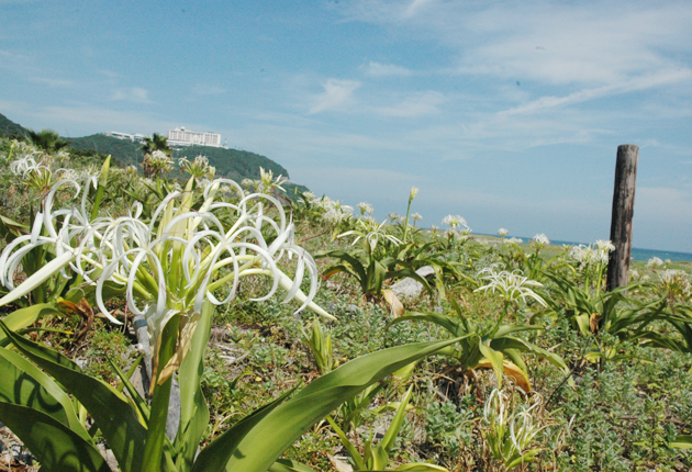 若手自営業者から成る、渥美青年経済研究会(植田博文理事長)が自生復活を目指す、海浜植物「ハマユウ」が、伊良湖岬で見ごろを迎えている。 ハマユウ(浜木綿)は、本州中部以南の暖かい海岸に生えるヒガンバナ科の多年草。青い海を背景に、白く細長い花...