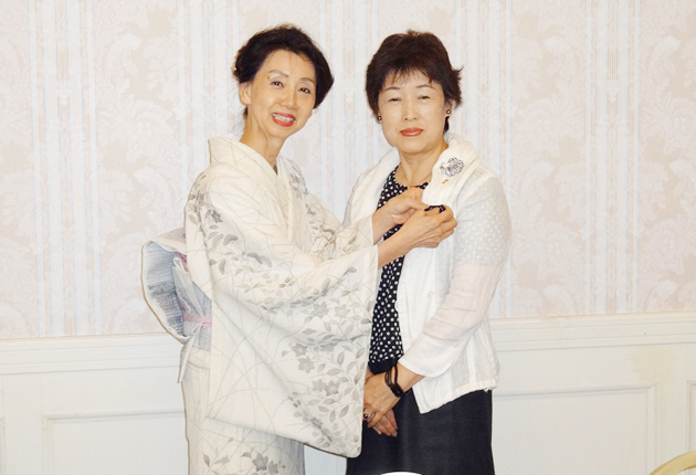 後田寿子会長㊧から会長ピンを贈られる本多昭子新会長㊨