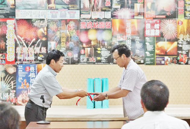 東海日日新聞社賞の賞状を受けるトリックスメタル・明輝クリーナー・札木町青年会の代表者㊨