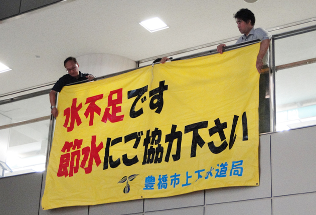 庁舎内に取り付けられた節水を呼びかける横断幕(豊橋市役所で)