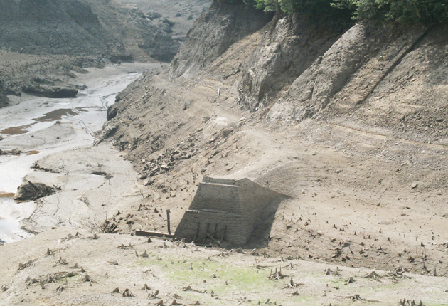 貯水量が減り、湖底があらわになった宇連ダム(18日撮影、豊橋市提供)