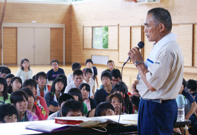 菅原進さんの話に真剣に耳を傾ける高校生たち(大島小体育館で)