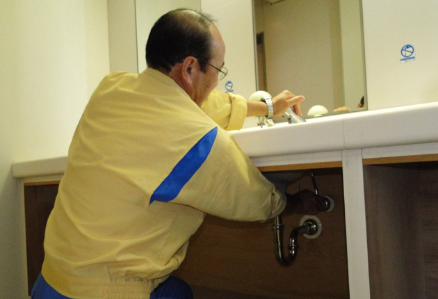 洗面所の給水バルブを調節する作業(豊橋市役所で)