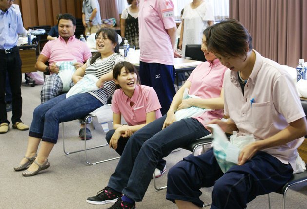つけ方によるオムツの快適さの違いを実践でたしかめる職員ら