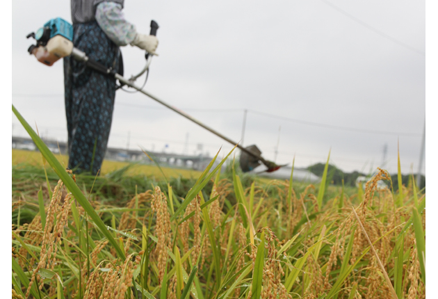 雨粒がつく稲穂の横で農作業する女性