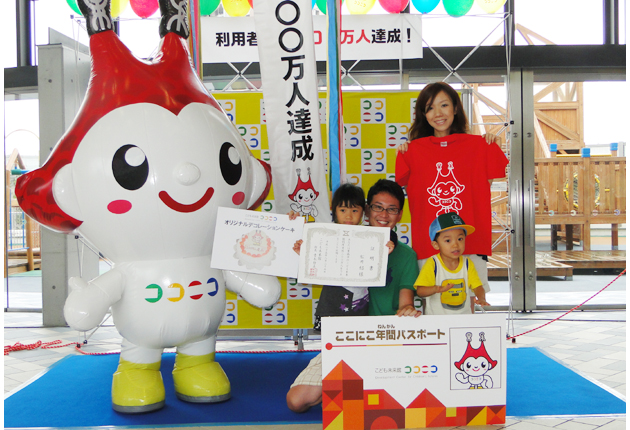 こども未来館(豊橋市松葉町、青木哲夫館長)は25日、延べ利用者数300万人の達成を祝うセレモニーを開き、入場者となった家族に記念品を贈った。 300万人目の入場者は静岡県浜松市の団体職員、松井大さん(30)、妻の裕子さん(30)、長女の結...