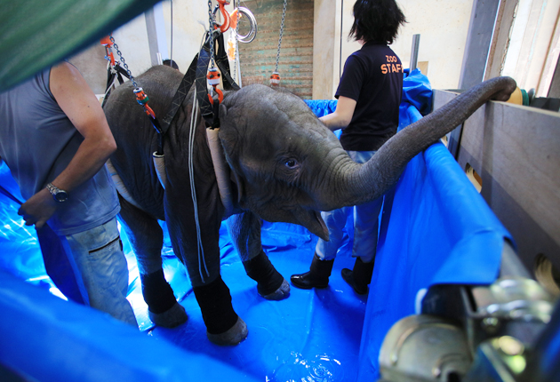 簡易プールでリハビリを行うマーラ(豊橋総合動植物公園で)