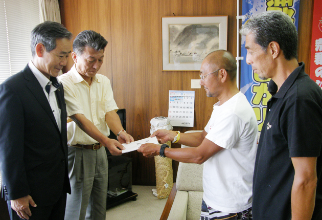 蒲郡市の三河大島海水浴場にある同島売店組合の柘植基成組合長と海の家「ビーチハウス アスティ」の古橋正店長は29日、市役所を訪れ、イベントの収益金12万3000円を市社会福祉協議会に寄付した。稲葉正吉市長が立ち会った。 4日開いたイベントで...